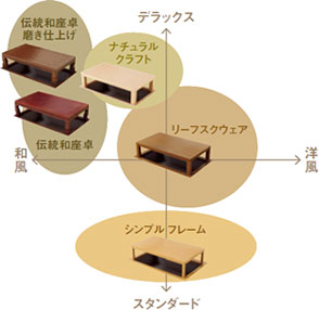 上部の座卓と、足元の炉箱を別々にチョイスできる掘こたつユニット。 炉箱は、一年を通して使用できる〈オールシーズンタイプ〉と、掘こたつとしての基本性能をおさえた〈ベーシックタイプ〉からお選びいただけます。 |